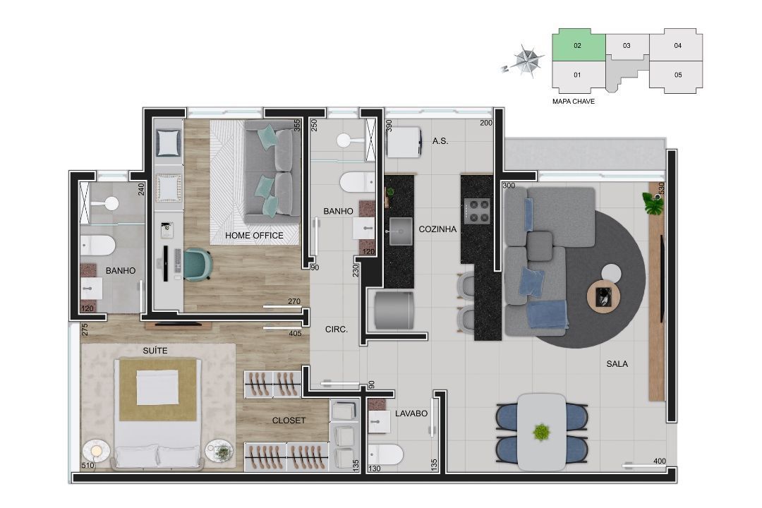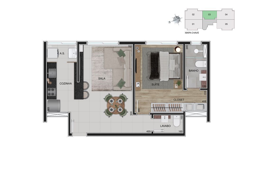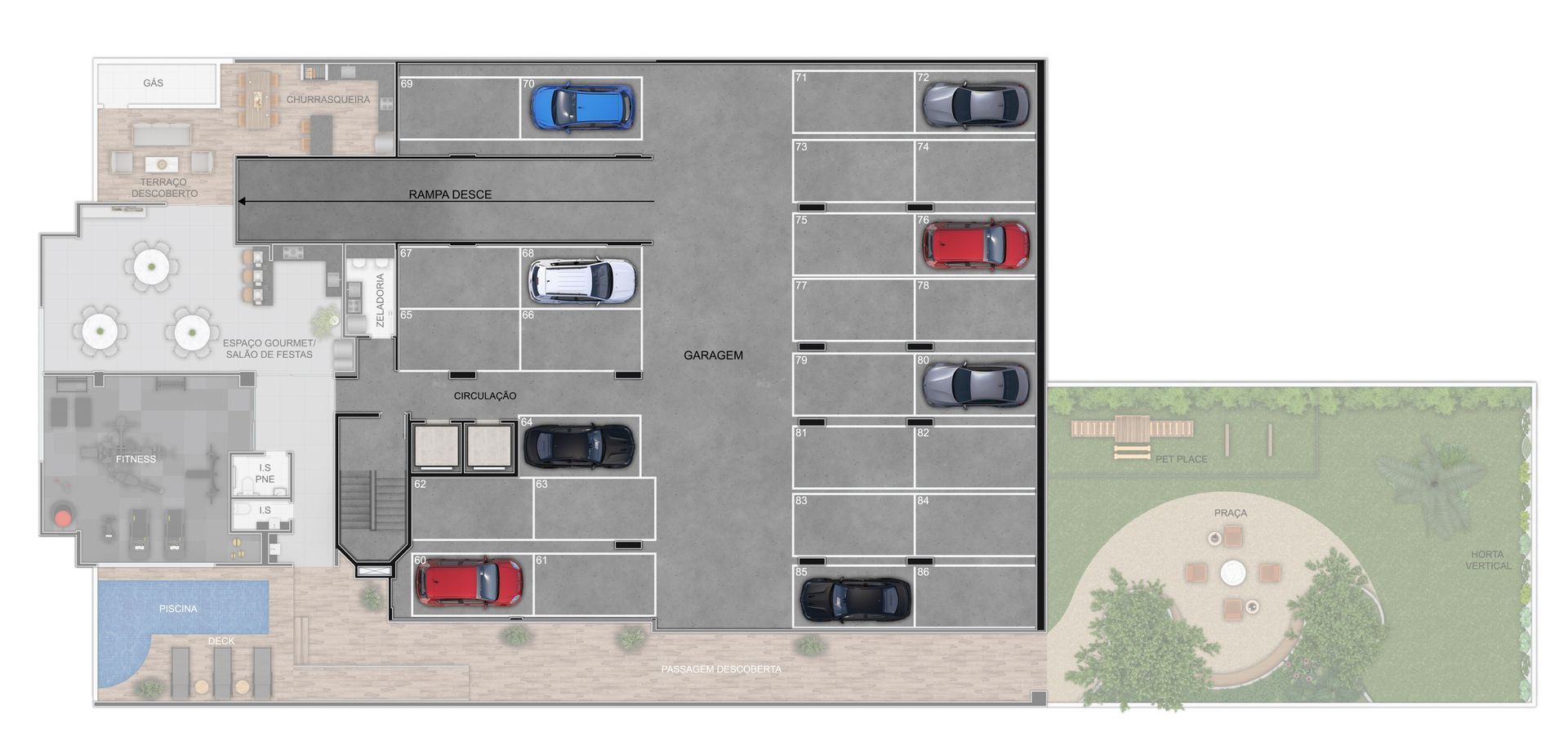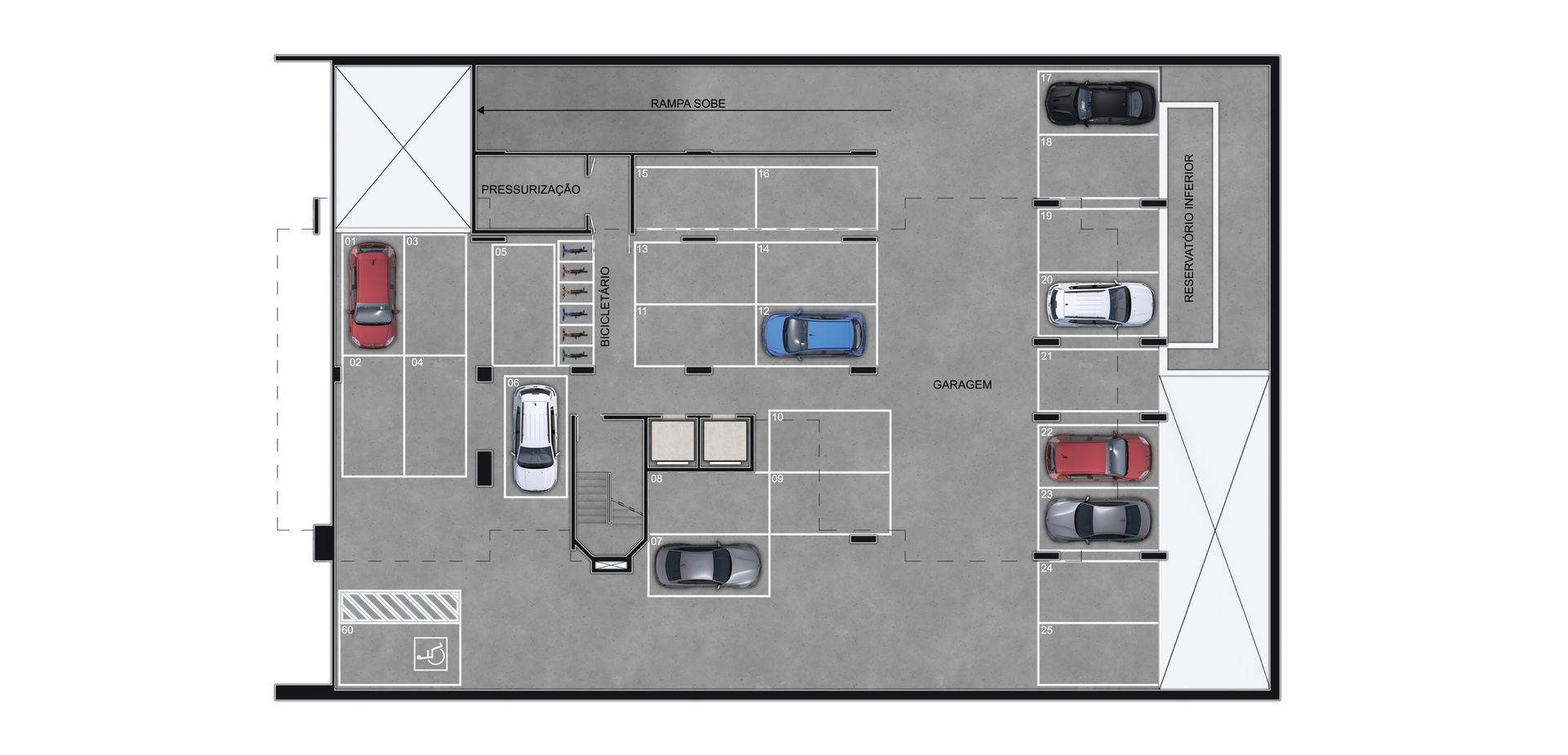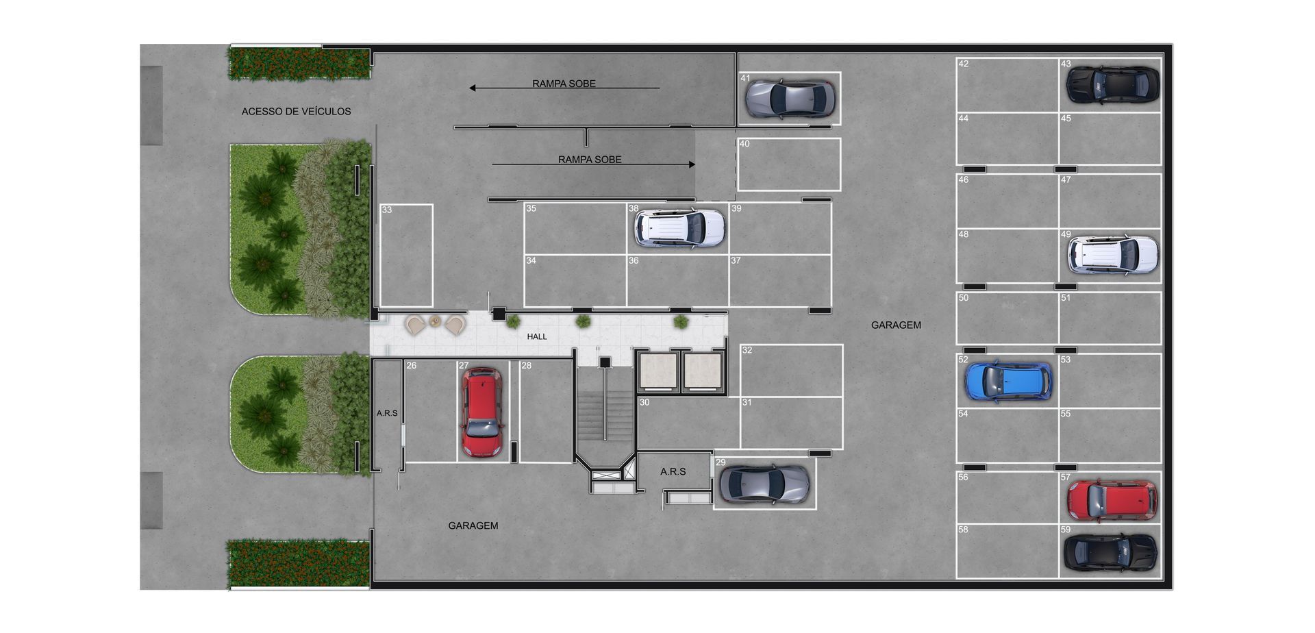 Condomínio com 50 apartamentos, 40 de 2 quartos e 10 de 1 quarto, distribuídos em 10 andares. Cada andar com 5 apartamentos e três andares de garagens e pilotis, oferecendo praticidade e comodidade.